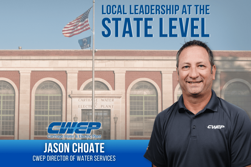 CARTHAGE, Mo. – Carthage Water & Electric Plant (CWEP) is proud to announce that Jason Choate, Director of Water Services, has been appointed by Governor Mike Kehoe to serve on the Missouri Safe Drinking Water Commission.