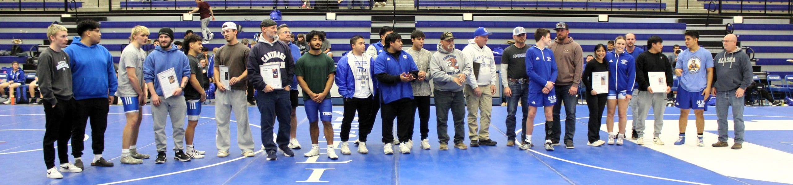 The Tigers also took time to recognize Carthage Wrestling alumni, presenting a legacy letter to 9 individuals. A legacy letter is a chance for a previous wrestler to share their own wrestling experience in order to pass on a tradition of learning and growth. It allows our current wrestlers to hear from those who have finished wrestling and to learn their lessons together. Coach Kelly is encouraging all alumni to fill out the form to create their own legacy letter to share with the team. The following alumni were presented letters: